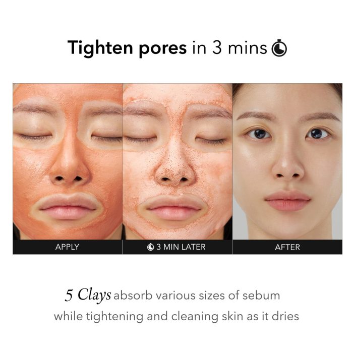 • Formulated with Kaolin Bentonite, Canadian Colloidal Clay, and Montmorillonite lite to help with exceeding sebum control, tightening pores, and caring skin texture smoothly.