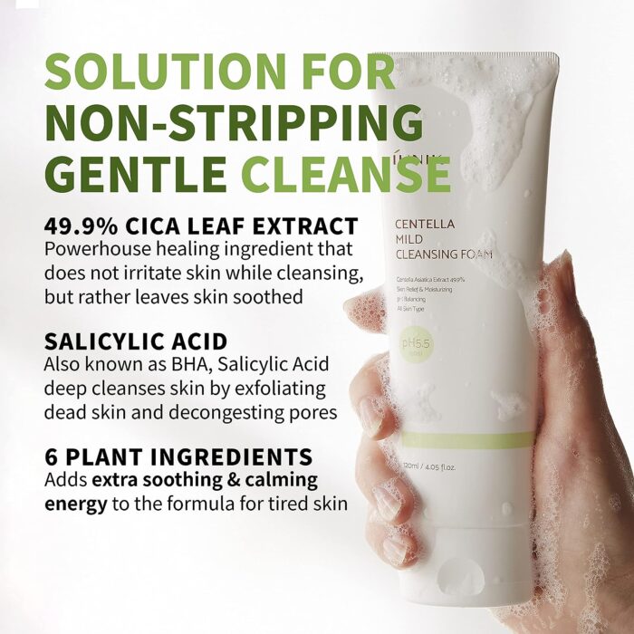 - A mild cleansing foam infused with 49.9% Centella Asiatica Extract to rid skin of impurities without causing irritation.